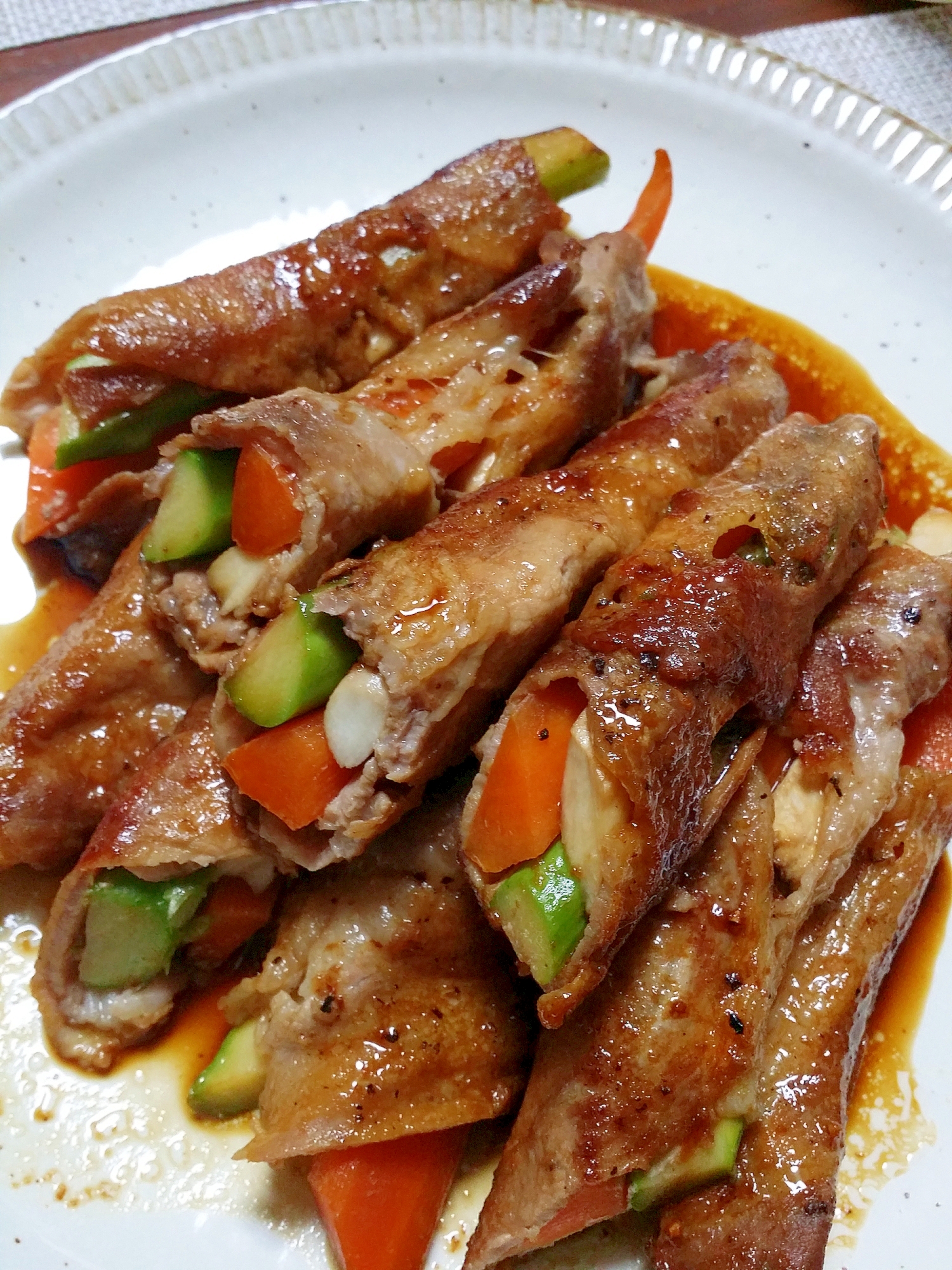 アスパラの肉巻きを甘辛いタレに絡めました☆ご飯がめっちゃ進んで野菜も取れます!