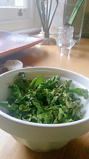 ケールのチップスはイギリスでも人気ですが、私はオリエンタルにごま油で香ばしく作ってみました。ヘルシーなスナックの完成です。