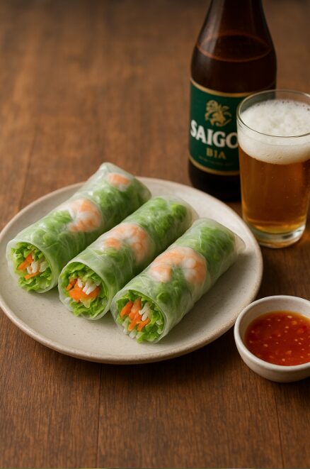 333ビールの軽快なのどごしは、生春巻きの爽やかさを際立たせ、フォーやボブンの深い味わいをすっきりと洗い流してくれます。