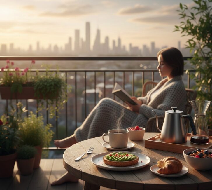 私が夢見るバルコニーでの朝食。それは、自分を甘やかす時間であると同時に、今日という一日を戦うための戦略的な休息でもあります。